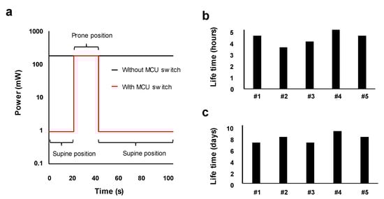 This MCU switch, which consumes less than 1 mW per one switching cycle, significantly reduces the total power consumption of the sensor. Without the MCU switch, the sensor consistently consumes 180 mW and operates for less than 5 h with the paper battery (see Figure 3a,b). However, with the MCU switch, the total power is reduced to being only 1 mW in an idle state when the wireless function is not needed. The incident of rolling over rarely occurs, but is fatal with infants []. To test the battery life time, we assumed an extreme condition that the infant’s body flips twice an hour. For babies under six months, an average sleep time is approximately 15 h a day []. We designed a battery test equipment that flipped the wearable sensors twice an hour and then observed an operating time without battery change. As shown in Figure 3a, the average power consumption of our device was found to be 0.94 mW. As the paper battery capacity was found to be 115.5 mWh, the theoretical battery life time was estimated to be 8.2 days. We experimentally confirmed that our sensor can be used for 7.8 days on average without charging, as shown in Figure 3c. We greatly reduced the power consumption of the wearable sensor by controlling the power supply to the energy-intensive components with simple circuitry. For this sleep monitoring application, the caregivers can receive an alarm message immediately through their smartphone by charging the wearable sensor only once a week.
