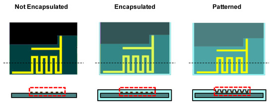 Using the ANSYS HFSS program, we calculated the antenna performance in three cases: no encapsulation, full encapsulation with polymer, and locally patterned encapsulation, as depicted in Figure 4. In the patterned sample, the encapsulating polymer right above the Bluetooth antenna was locally removed.