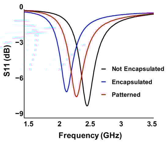S11 parameter vs. frequency for each antenna structure. The value at the Bluetooth communication frequency (2.4 GHz) was calculated to be −8.16 dB (not encapsulated), −2.77 dB (encapsulated), and −6.04 dB (patterned).