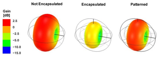 Antenna three-dimensional radiation pattern at 2.4 GHz for each structure. Maximum gain of each structure was 0.04 dB (not encapsulated), −3.22 dB (encapsulated), and −0.54 dB (patterned).