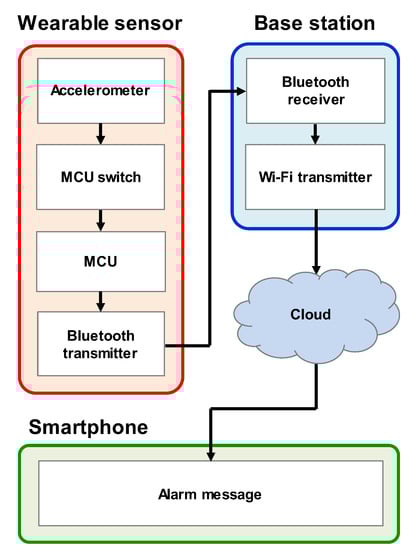 The sleep position monitoring system was composed of a wearable sensor, base station, and smartphone, as shown in Figure 8. In the wearable sensor part, the infant’s sleep position is detected by an accelerometer sensor. An electrical switch supplies power to the MCU only when the infant is in a prone position. Because the MCU, which consumes the largest amount of power, is powered only when the wireless communication system needs to operate, the total power consumption is greatly reduced. When the MCU is on, it sends a wireless signal to the base station using a Bluetooth transmitter. The base station is a repeater that can be powered by an outlet or a high-capacity battery. It consists of a Bluetooth receiver, MCU, and Wi-Fi transmitter. When the base station receives a signal from the wearable sensor, it sends an alarm message to the caregiver’s smartphone through Wi-Fi communication. Then, the caregivers can come to the infant immediately and lay him/her on his/her back. The wearable sensor and caregiver’s smartphone could communicate directly without the base station, but this configuration significantly increases the power consumption of the wearable sensor. Because the base station takes full responsibility for the communication through the cloud, the wearable sensor can maintain a low-power state.