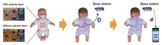Demonstration of the infant sleep monitoring system. The infant doll was placed on its back. When the doll was rolled over, the sensor inside the clothes detected the inappropriate position and sent a signal to the base station through Bluetooth. The sensor was embedded in the red dashed box. The base station transmitted the signal from the sensor to the caregiver’s smartphone through Wi-Fi.
