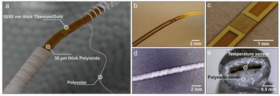Temperature sensors were fabricated on a 50 μm thick polyimide substrate. The individual sensors were 75 mm long and 1 mm wide. This elongated form factor was designed to optimise the yarn embedding process. The active layer of these devices consists of 10/60 nm Ti/Au. Ti was deposited to improve the adhesion of Au to the polyimide substrate, whereas Au was used as the thermally sensitive layer. Both materials were deposited through e-beam evaporation and patterned using lift-off. The devices were passivated with a 2 μm thick SU-8 blanket layer deposited through spin-coating. Following their fabrication, the sensors were separated from the main substrate using a dicing saw. A flexible sensor strip is displayed in Figure 1b,c, while Figure 1a shows a representation of the final sensors embedded in the yarns.