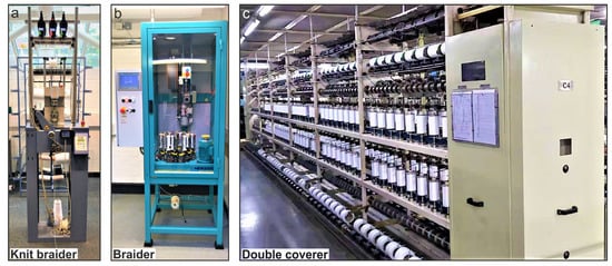 Industial machines utilised for covering the flexible RTDs. (a) Rius MC/2 knit braider from RIUS-COMATEX used to create the knit braided yarn. (b) RU 1/24-80 braiding machine from Herzog® utilised to fabricate the braided yarn. (c) Menegatto 1500 (Menegatto S.r.L) used to build the double covered yarn.