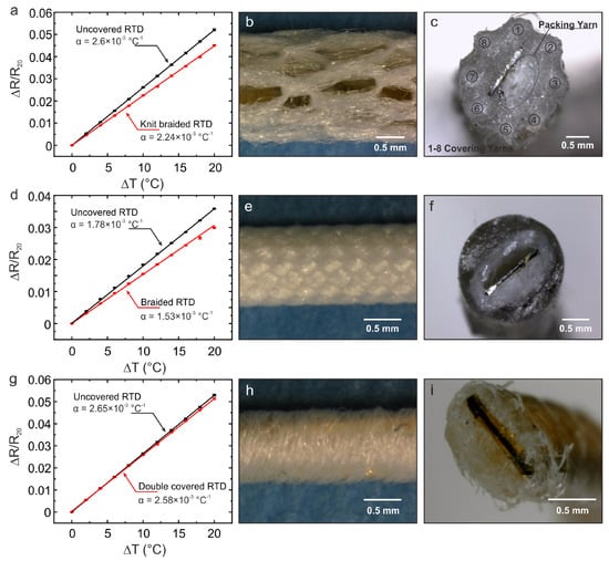 Change in resistance as a response to the change in temperature before and after the RTDs were covered using the three different covering techniques. A linear fitting was applied to calculate . (a) Measurements from the RTD positioned within a knit-braided structure. The RTD incorporated in the structure has an effective  of 2240 ± 6 × 10−6 °C−1 compared to an  of 2600 ± 4 × 10−6 °C−1 when it was not covered. (b) Close-up image of the knit-braided yarn obtained using a Dino-Lite premier digital microscope (New Taipei City, Taiwan). (c) Cross section of the knit braided yarn captured using the digital microscope. (d) The RTD positioned in the braided yarn has an  of 1530 ± 8 × 10−6 °C−1 compared to the uncovered RTD’s  1780 ± 7 × 10−6 °C−1. (e) Close up of the braided yarn. (f) Cross section of the braided yarn obtained using the digital microscope. (g) The RTD covered using the double covering technique has an  of 2580 ± 1 × 10−6 °C−1 when compared to 2650 ± 8 × 10−6 °C−1 when it was uncovered. (h) The double-covered yarn close up and the cross section of it shown in (i).