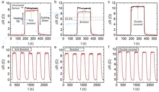 Response time and cyclic experiments for the yarns. For response time experiments, a representative comparison before and after embedding the thin-film temperature sensors into the yarns is presented. The measurements of response time from the knit-braided, braided, and double-covered yarns before and after they were covered are shown in (a–c), respectively. The thermal time constant corresponds to the time taken by the sensor’s resistance to reach 63.2% of the final value once a sensor is subjected to a step change from ambient temperature to 40.0 °C and vice versa. This is indicated by the horizontal dashed lines in (b) which correspond to 63.2% of the maximum value. Finally, (d–f) are the results from the cyclic tests conducted on the knit-braided, braided, and double-covered yarns, respectively, where the temperature was cycled from 20.0 °C to 40.0 °C for 5 cycles.