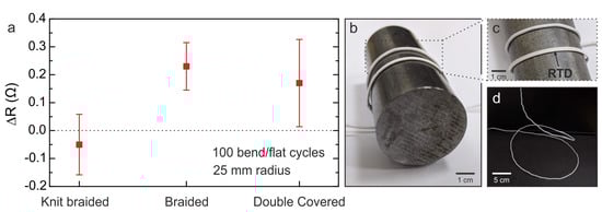 Yarns, when manufactured into textiles, undergo several cycles of bending. When the flexible RTD is bent, it induces a strain on the surface of the thin active metal layer. This can lead to a rupture or a change in resistance as a result of the strain [,]. Therefore, the following experiments were conducted to identify the effects of bending on the performance of the yarns. Initially, the temperature-sensing yarns were kept on the hot plate set to 40 °C for 3 min. Afterwards, they were removed from the hot plate and underwent 100 bend/flat cycles around a 25 mm cylinder. Finally, the temperature sensor was reattached onto the hot plate for a further 3 min. The temperature measured between 2.5 min to 3 min after the yarns were positioned on the hotplate before and after bending was utilised to identify any changes in resistance. The 25 mm diameter was considered adequate since this roughly corresponds to the smallest bending radii in a human body (i.e., diameter of a finger).