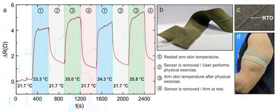 This experiment was set up to determine the yarn’s ability to measure variation in skin temperature during a physical activity. The measurements of the armband are shown in Figure 6a. The results show that the resistance increases as soon as the armband is worn. Nevertheless, it does not return to its original resistance when the armband is taken off and left at room temperature. This is most likely due to the thermal inertia of all the materials surrounding the sensor and due to the low thermal conductivity of the wool armband which retains the heat of the body. Figure 6a also displays the increase in temperature as a result of the physical activity when compared to when the arm was left to rest. This pattern repeats on the second set of experiments. The results show an adequate performance of the sensing yarns for measuring skin temperature in sport applications.