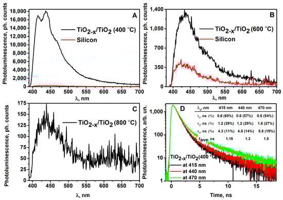 - Kernazhitsky, L.; Shymanovska, V.; Gavrilko, T.; Naumov, V.; Fedorenko, L.; Kshnyakin, V.; Baran, J. Room temperature photoluminescence of anatase and rutile TiO2 powders. J. Lumin. 2014, 146, 199–204. [Google Scholar] [CrossRef]