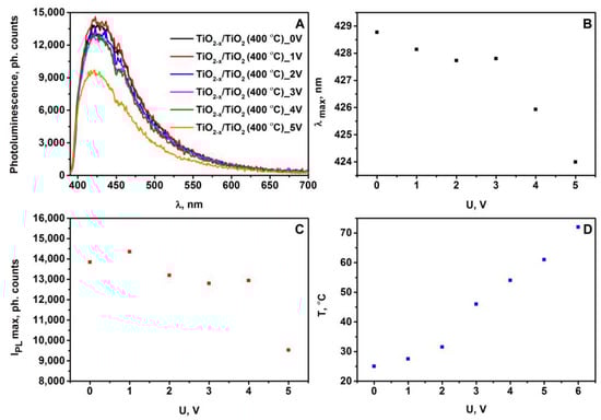 3.3. Photoluminescence Properties of Hybrid TiO2-x/TiO2-Based Structures