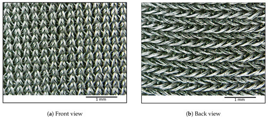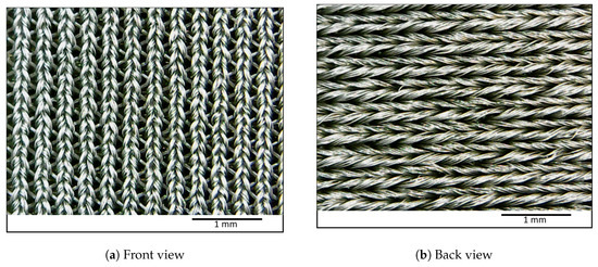 The fabric has a double knot weave structure to allow both horizontal and vertical stretching. Figure 1a shows the front view of the unstretched fabric, and Figure 1b shows the unstretched backside of the fabric. The weaving pattern is arranged such that, during the horizontal stretch, the back threading get loosened while the front threading get tightened.