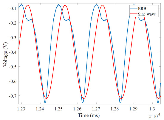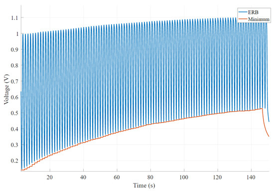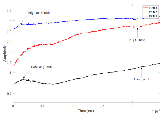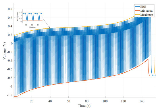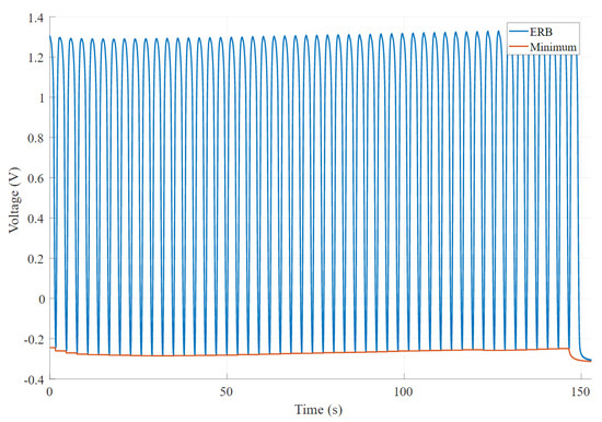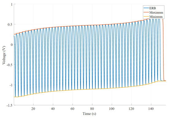 A moving window function has been implemented that returns both the minimum and maximum of the signal to get the peak-to-peak value as the difference between the two outputs [35]. Figure 8 shows an example of a signal chosen from 270 band recordings that changes the amplitude with time. It is clear that this signal became complex, and amplitude decreases with time. Figure 9 shows an experimental band that results in a minimum change of the signal’s amplitude. In this scenario, the baseline of the signal changes; however, amplitude remains the same.