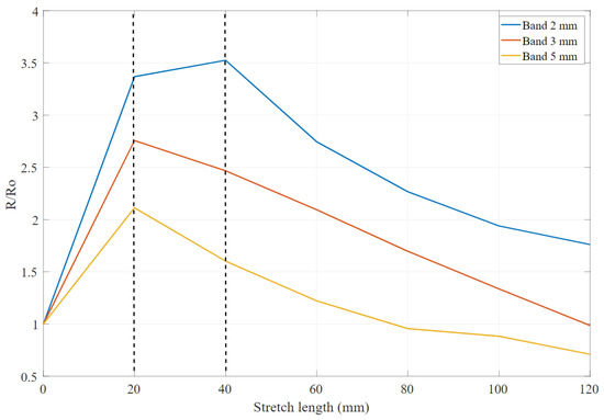 A length of 225 mm bands was used for all experiments. The bands were pre-stretched up to 10 mm to prevent slacking when fully contracted. As expected, bands with large width show lower initial resistance. For experiments that involve impedance linearity and impedance per unit length, the band resistance was measured by a Fluke 117 (Everett, WA, United States) digital multi-meter (DMM) [31] using the two-probe method (probe directly touching each end of the band) with ±0.9% + 0.2 error. The length measurements were taken using a standard ruler with 1 mm resolution.