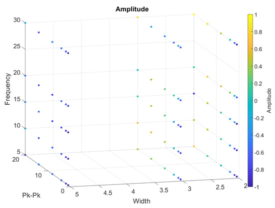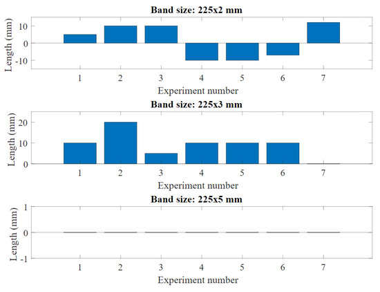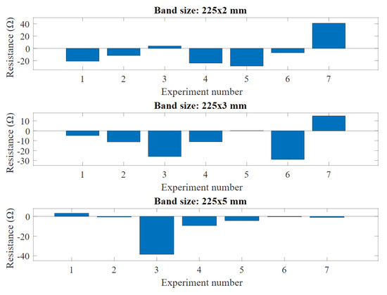 Three identical (length and width) bands were tested together with channel multiplexing so that each experiment has three recordings. A total of 270 recordings were taken varying all the parameters. The experiment reading is in 24-bit to two’s complement format with the ADC reference at V. All acquired data were read from an SD card using proprietary binary to American Standard Code for Information Interchange (ASCII) conversion software and transferred to the MATLAB software (MathWorks, Massachusetts, United States) environment for further analysis. The data were pre-processed to make all signals start from the same phase to efficiently compare their performance. The data analysis is based on the following parameters: