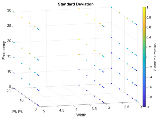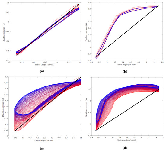 The output variables space is ninety different experiments on the band. Each fabric band (i.e., 225 mm × 2 mm, 225 mm × 3 mm, 225 mm × 5 mm) was tested thirty times on different frequency and stretch length. We started stretching the band from 1 mm to 20 mm and set the frequency to begin from 5 cycles/min to 30 cycles/min. We have observed the band output voltage that became stable after 1.5–2.5 min; therefore, each experiment was aimed to last for a minimum of five minutes. We also measured the initial and final length/resistance of the band before/after every experiment. The actuator output was compared with the internal rotary encoder to confirm a precise interpolation of the sinusoidal expansion/contraction. For every experiment, the data were saved and checked individually to ensure that the analogue signals were correctly converted and output voltage data were stored as a binary file on the SD card.