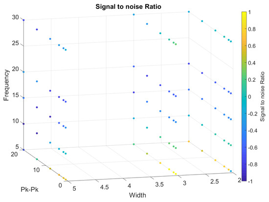 Secondly, we remove the zero frequency signal from FFT output and take the frequency that produces maximum value corresponding to the fundamental frequency (). Thirdly, the fundamental frequency amplitude and the full FFT output signal are raised to the power of two and subtracted to get the component. Finally, we calculate SNR as the base 10 logarithms of the ratio between fundamental frequency power and noise power. Equations (3)–(5) illustrate the calculation steps to get the SNR value in the decibel log scale: