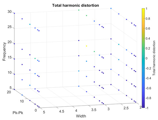 In Figure 11, we have visualized the value of the fundamental frequency and the contribution from subsequent harmonics. These values are used in Equation (1) and then multiplied by 100 to calculate the THD percentage.