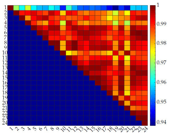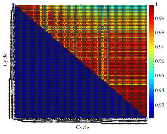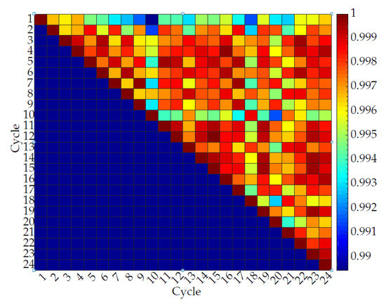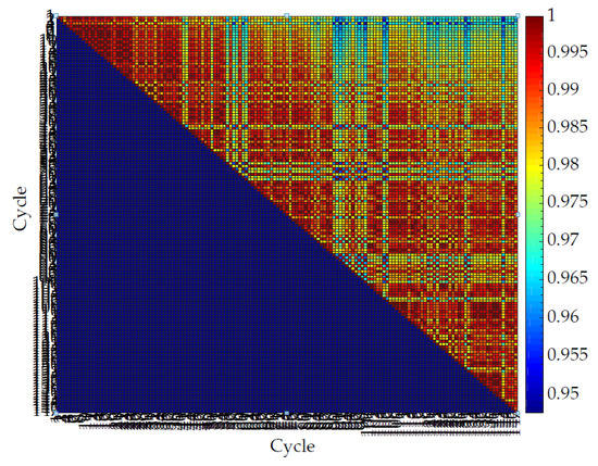 Let N sine motions of frequency f and amplitude A recorded in a continuous recording. The maximum normalized cross-correlation function is used as the similarity function where output is 0–1, where 1 is the perfect match. For each sine motion S, the maximum cross-correlation where M is the cross-correlation of and calculated. For each sine motion, the correlation function was applied to result in a vector V,
