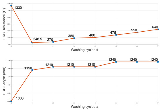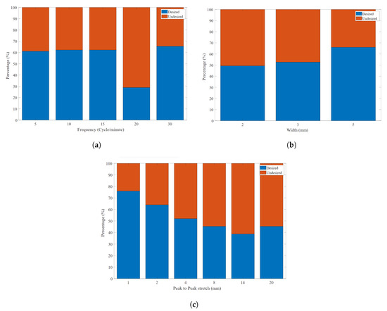 We have chosen these iteration frequencies to be between 5 and 30 cycles/min because the study targets reproducing respiration. The normal respiration rate is between 10 and 20 cycles/min according to [34]. The stretch length is chosen to be between 1 and 20 mm to prevent the fabric band from reaching its permanent deformation point and avoid any possible damage for its physical and electrical properties. Every band was stretched less than 25% of its original length.