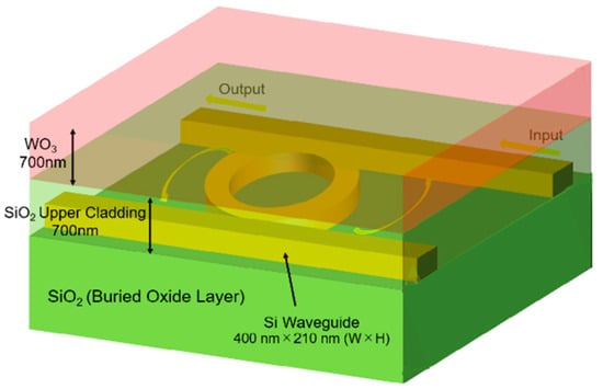 Figure 1 shows a schematic view of the proposed Pt-WO3/Si-MRR-based H2 gas sensor. The racetrack-type Si-MRR is coupled with two busline waveguides through directional couplers. The optical power coupling efficiency K is controlled by the length of the directional coupler. The waveguides are Si wires with a height of 210 nm and a width of 400 nm. The Si waveguides are surrounded by SiO2 cladding layers. The upper cladding layer of the waveguide of the MRR is composed of Pt-WO3/SiO2 layers. The thicknesses of the Pt-WO3 and SiO2 upper cladding layers are both 700 nm. The MRR is thermo-optic-driven and senses a change in temperature. When the temperature in the MRR changes, the equivalent refractive index of the waveguide also changes, leading to a shift in the resonant wavelength of the MRR. The device parameters of the sensor are summarized in Table 1.