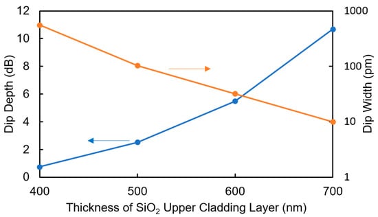 Calculated dip depth and width at 0.1 dB from the bottom of the dip for the MRR with LMRR = 69.3 μm and K = 0.2 as a function of the thickness of the upper SiO2 layer.