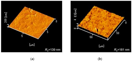 Atomic force microscopy images of the surface of the WO3 layer over areas of (a) 10 × 10 μm2 and (b) 100 × 100 μm2. Ra denotes average roughness.