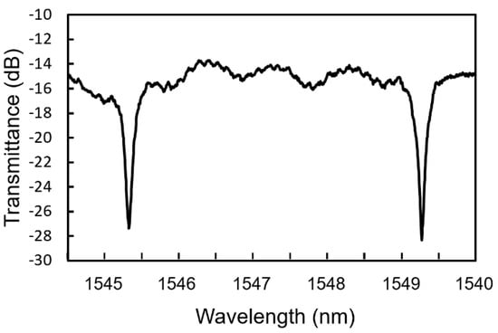 Figure 6 shows a transmittance spectrum of the fabricated MRR. The free spectral range (FSR) was approximately 4.05 nm, which is almost equal to the theoretical value. The Q factor of the MRR evaluated from the full width at half maximum of the resonant dips was 5164.