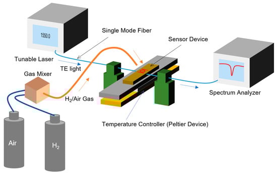 Figure 7 shows a measurement setup for the characterization of the MRR sensor. The fabricated MRR sensor was directly exposed to hydrogen/air mixed gases with different hydrogen concentrations. Pure hydrogen and dry air from gas cylinders were mixed with a gas mixer (KOFLOC Corp., Kyoto, Japan). The flow rate of the mixed gas was fixed at 1.0 L/min with a mass flow controller in the gas mixer. The polarization of a continuous-wave light from a tunable laser (8164A, Agilent Technologies, Inc., Santa Clara, USA) was controlled to the transverse electric (TE) mode using a polarization controller (PAT9000B, Thorlabs Japan Inc., Tokyo, Japan), and the TE-polarized light was incident on the input port of the MRR sensor. The transmittance of the laser light in the vicinity of 1550 nm from the input port to the drop port was measured using a spectrum analyzer (Agilent, 8164A). The temperature of the sensor, Tsen, was controlled using a thermoelectric temperature controller based on a Peltier device.