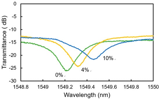 Figure 8 shows the measured spectra of the transmitted light for hydrogen gases with the concentrations of 0 to 10 vol% at Tsen = 20 °C. With the exposure to the gas, a resonant wavelength showed a redshift with a change in the depth of the dip at the resonant wavelength. The change in the depth of the dip was caused by the increase in the absorption coefficient when the WO3 formed HxWO3, which is discussed later.