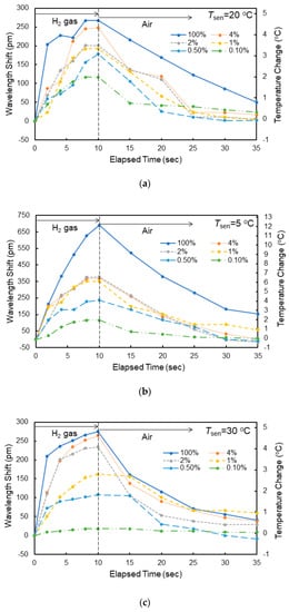 Figure 9a shows the dependence of the shift in resonant wavelength on the elapsed time measured at Tsen = 20 °C for various hydrogen concentrations. The corresponding increases in temperature in the Si waveguide evaluated using the measured temperature coefficient dλ0/dT are also shown. The shift in resonant wavelength saturated at the elapsed time of 10 s after exposure to the hydrogen gas; therefore, the gas flow was stopped at 10 s in the experiment, and the atmosphere was switched to air. The response time was approximately 8 s for all gases. After stopping the exposure to the hydrogen gas, the resonant wavelength returned to its original value with the reaction of oxygen in air. Although the wavelength shift decreased with decreasing hydrogen gas concentration, a wavelength shift of as large as 117 pm was obtained for 0.1% hydrogen gas, showing the high sensitivity of the fabricated sensor to hydrogen gas. The shift in wavelength and response time depend on the gas flow rate. For example, the wavelength shift decreased by 20% and the response time increased by 50% for 4 vol% hydrogen gas at Tsen = 20 °C when the gas flow rate was changed from 1 to 0.25 L/min. This is probably because the rate at which hydrogen was absorbed into the WO3 layer decreased by lowering the gas flow rate. Figure 9b,c, respectively, shows the dependence of the shift in resonant wavelength on the elapsed time measured at Tsen = 5 and 30 °C for various hydrogen concentrations. At each temperature, similar resonant wavelength shifts were observed, but there was a difference in the magnitude of the wavelength shift. Figure 10 shows the wavelength shift as a function of the elapsed time upon exposure to 4.0 vol% hydrogen gas at different temperatures. The wavelength shift decreased with increasing Tsen, although there was little difference in response time. There is a reading error of ± 5 pm and the resolution of a wavelength of the spectrum analyzer is 10 pm. Therefore, the accuracy of the wavelength is ± 15 pm (7.5% error for the wavelength shift of 200 pm) in the wavelength measurements.