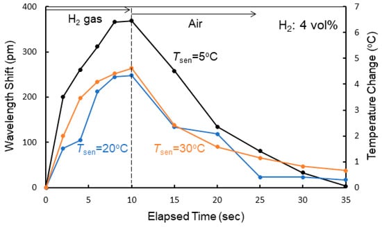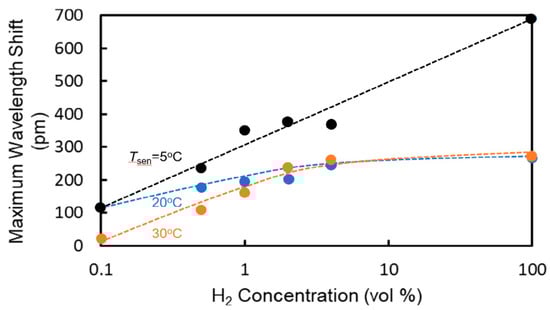 Figure 11 shows the dependence of the wavelength shift at an elapsed time of 10 s on the hydrogen concentration at each temperature. Although the wavelength shift shows dependence on Tsen, high sensitivity to hydrogen was obtained at each temperature. The wavelength shifts saturated above 1 vol%. The cause of this saturation is considered to be the saturation of coverage of hydrogen molecules on the platinum catalyst, that is, the number of hydrogen molecules absorbed on the Pt-doped WO3 saturated. To increase the sensitivity at higher hydrogen concentrations, the dispersion of Pt atoms in the WO3 layer must be improved.