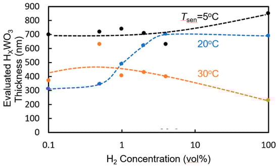 As shown in Figure 8, the depth of the dip at the resonant wavelength changes upon exposure to hydrogen gas. This change in dip depth is mainly caused by the increase in the absorption coefficient when WO3 forms HxWO3. However, the measured change is not consistent with that when the entire WO3 layer is assumed to form HxWO3. This shows that only part of the WO3 layer on the surface side forms HxWO3. We evaluated the thickness of the HxWO3 layer using the measured change in dip depth on the assumption that the cause of the change is the increase in the propagation loss of the WO3/HxWO3 layer. Figure 12 shows the relationship between the evaluated thickness of the HxWO3 layer on the surface side and the hydrogen concentration of the gas to which the sensor is exposed. At Tsen = 20 °C, the evaluated thickness of the HxWO3 layer increases with increasing hydrogen concentration. On the other hand, at Tsen = 5 °C, the evaluated thickness of the HxWO3 layer is approximately 700 nm, and the entire WO3 layer is considered to have formed HxWO3. In the case of Tsen = 30 °C, the evaluated thickness of the HxWO3 layer is approximately 400 nm and almost constant. One of the reasons for the dependence of the change in resonant wavelength on Tsen in Figure 9 is considered to be the change in the thickness of the HxWO3 layer with Tsen. To improve the sensitivity to lower hydrogen concentrations of less than 2.0 vol% at higher Tsen, the thickness of the WO3 layer must be decreased, even though the accuracy of hydrogen concentration measurement decreases at higher concentrations.