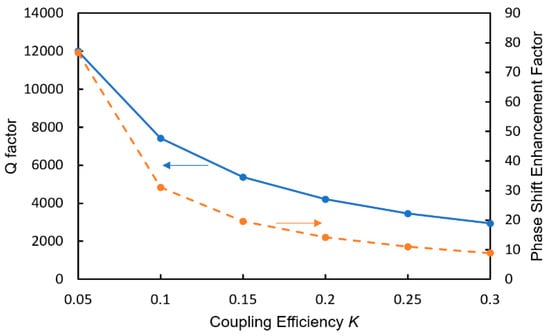 Dependence of the Q-factor and the phase shift enhancement factor Δφeff/Δφ on K.