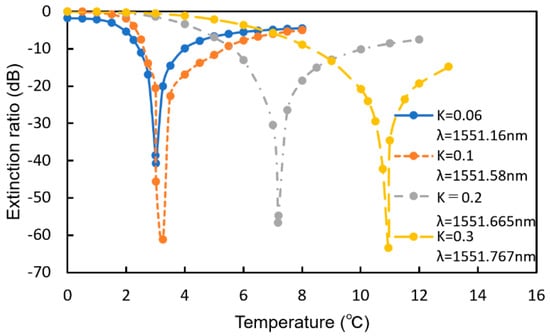 Figure 16 shows the extinction ratio as a function of the increase in temperature for various coupling efficiencies (K). With decreasing K, the sensitivity to the temperature increases. If we assume that the MRR is the same as that previously discussed (K = 0.2, Q-factor = 4220), the temperature of the MRR increases by approximately 2.0 °C for 0.1 vol% hydrogen gas at Tsen = 20 °C, and a change in the extinction ratio larger than 40 dB is obtained if the operation wavelength is set at a suitable value, which is much larger than that of the simple MRR (less than 10 dB). One of the advantages of the MMR-MZI sensor is that the extinction ratio is very sensitive to the concentration of hydrogen. If the detecting wavelength is fixed at an appropriate value, the transmittance changes significantly upon exposure to hydrogen, and a much higher sensitivity can be realized without a spectrum analyzer.