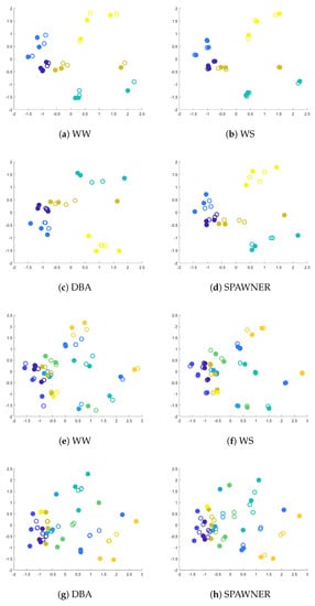 The scatter plots containing MDS representations of the first 15 and 25 sequences and the resulted augmented samples from AUSLAN dataset are shown in Figure 2. The number of considered sequences is low to facilitate the visualization. The case in which more samples are used (i.e., Figure 2e–h) is presented to highlight the difficulty of the classification task in which more similar samples from different classes are taken into consideration. Larger or smaller dissimilarities, reflected by DTW distances, correspond to larger or smaller Euclidean distances between points in plots. As shown, WW and WS tend to create new samples close to the original time-series, as they share most of their parts. This can be beneficial in tight spaces between classes (Figure 2e,f) where samples from different classes are close to each other and may confuse a classifier. However, for some datasets, they are unable to create samples that would use space between original sequences. Here, DBA and SPAWNER, put new samples in space between input sequences, often creating new boundaries that can be closer in the nearest neighbor sense than it can be observed for the original data. Also, the diversity of the obtained time-series for these methods is larger in comparison to WW and WS methods. In contrary to DBA, the introduced SPAWNER does not concentrate samples in the center of the cluster for a class (cmp. Figure 2c,d). In such cases, the generation of new samples does not bring an additional advantage, since input samples cover the area. Some input sequences are introduced that are closer to other classes than to the rest of the samples from their class. Here, SPAWNER create samples that connect the outlier sequence to its class, DBA seems to use the sequence to create a new one that slightly shifts the class boundary in the direction towards the outlier, and warping with slicing techniques create sequences in its neighborhood. This can be seen for horizontally placed examples of the “green” class shown in Figure 2a–d. Interestingly, with additional samples from the dataset, the plots begin to show the difficulty of the classification task caused by the similarities between classes (Figure 2e–h) and new class boundaries created by SPAWNER and DBA.