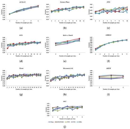 Since some datasets may contain only a few examples, the usability of the time-series augmentation method introduced in this paper is examined on benchmarks with a reduced number of samples. For each dataset, randomly selected samples are used for the augmentation. In the experiments, their number varied from two to the size that allows a time-series generation method to produce the dataset that doubles the size of the original dataset. The input examples are added to the generated examples. To compare data augmentation algorithms, the average classification accuracy of the NN-DTW method is used on ten benchmark datasets, taking into account ten runs for each number of examples per class. This classifier is used in tests as the number of performed experiments and the size of the training data make the application of the remaining classifiers unfeasible. The results are presented in Figure 3.