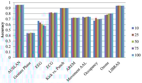 Since the augmentation proposed in this paper does not consider a rejection step of input outliers that may decrease the quality of the augmented time-series, a time-series selection is introduced that allows a given input time-series creating output sequence only with some of its neighbors. The results in terms of the average accuracy for 50 runs of the NN-DTW classifier for all datasets ranging the number of neighbors from 10 to 100% of input sequences are shown in Figure 4. As shown for all datasets, excluding the EEG which does not respond well to the augmented data, the access to more neighbors while creating new samples using input pairs is beneficial to the performance of the classifier. Consequently, it seems that the datasets do not contain outliers decreasing its performance and the more distant time-series should be involved in the time-series augmentation.