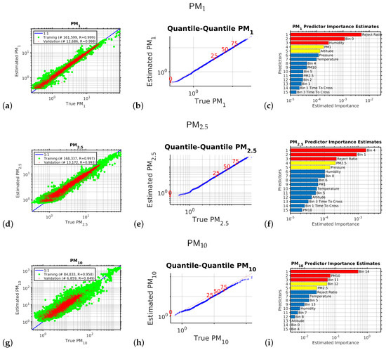 Figure 1 shows the the results of the multivariate non-linear non-parametric machine learning regression for PM (panels a to c), PM (panels d to f), and PM (panels g to i). The left hand column of plots shows the log–log axis scatter diagrams with the x-axis showing the PM abundance from the expensive reference instrument and the y-axis showing the PM abundance provided by calibrating the low-cost instrument using machine learning.