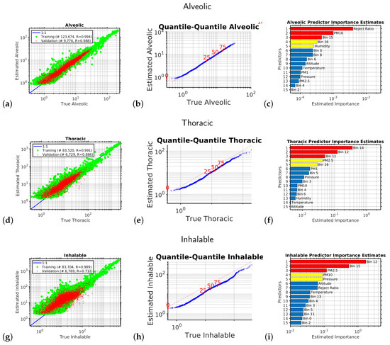 This figure shows the results of the multivariate non-linear non-parametric machine learning regression for the alveolic (panels (a)–(c)), thoracic (panels (d)–(f)), and inhalable size fractions (panels (g–i)). The left hand column of plots shows the log–log axis scatter diagrams with the x-axis showing the PM abundance from the expensive reference instrument and the y-axis showing the PM abundance provided by calibrating the low-cost instrument using machine learning. The green circles are the training data; the red pluses are the independent validation dataset. The blue line shows the ideal response. The middle column of plots shows the quantile–quantile plots for the machine learning validation data, with the x-axis showing the percentiles from the probability distribution function of the PM abundance from the expensive reference instrument and the y-axis showing the percentiles from the probability distribution function of the estimated PM abundance provided by calibrating the low-cost instrument using machine learning. The dotted red line shows the ideal response. The right hand column of plots shows the relative importance of the input variables for calibrating the low-cost optical particle counters using machine learning.
