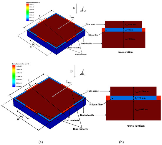In this work, the structure of the Hall sensor was considered symmetrical and orthogonal, and Figure 1 illustrates the 3D geometric model and cross-section of the FD-SOI Hall sensor. The structure consists of a P-type lightly doped silicon film (NA = 1 × 1016 cm−3) and four N-type heavily doped contacts (ND = 1 × 1021 cm−3) along four sides. The top and bottom layers of the silicon film are gate oxide and buried oxide, respectively. The length (L) and width (W) of the Hall sensor device range from 15 µm to 45 µm, which are typical values. The length of the Hall contacts (La) ranges from 0.25 × L to 0.93 × L and the width of the bias contacts (Wb) ranges from 0.25 × W to 0.93 × W, while the four contacts are located at the centers of the four sides of the sensor. The thickness of the silicon film is 50 nm, so that the device can reach the FD state under the corresponding low-doping conditions; this is further discussed in Section 3.3.