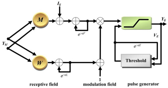 As inspired by the structure of visual cortex neuron, Johnson et al. proposed the PCNN model [39]. PCNN, which imitates the mechanism of mammalian visual cortex, is a laterally connected neural network of two-dimensional neurons with no training. As shown in Figure 2, each neuron of the standard PCNN model is divided into three sequential parts: the receptive field, the modulation field, and the pulse generator. It can be mathematically described as follows [39,40]: