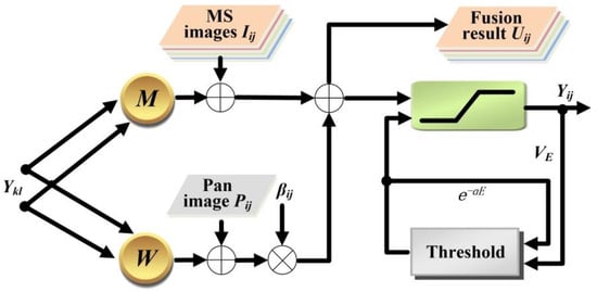 The part Iij + βij •Pij of the Equation (13) is similar to the traditional pansharpening method, except that βij changes in each iteration. It means that the proposed model has the injection mechanism which is beneficial for pansharpening application. In addition, some good characteristics have been inherited from the standard PCNN in the new model, such as the phenomenon of the synchronous pulse emitting and the exponential attenuation of the threshold. As exhibited in Equation (13), the influences to the current neuron are not only from the external stimulus (I and P), but also from the neighborhoods, which guarantee the synchronous pulse emitting mechanism. In other words, the neurons with similar neighborhoods and stimuli will emit the pulses at the same time. Once the stimulus is a high-resolution image, the synchronous pulse emitting mechanism will make the interpretation of boundaries and textures of the object more accurate.