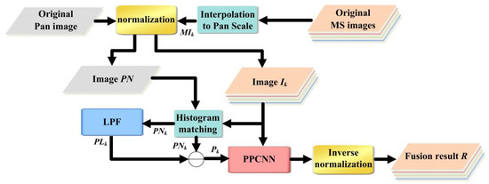 where k indicates the kth band of the multispectral images, and the total band number is K. Symbol max indicates the maximum value of all pixels. Consequently, Ik and PN are the corresponding normalized versions of MIk and PI. The architecture of the PPCNN pansharpening approach is shown in Figure 6, which consists of the following steps: