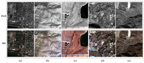 Datasets of pansharpening experiments. (a) Washington dataset. (b) Sichuan dataset. (c) Boulder dataset. (d) Lanzhou dataset. (e) Xinjiang dataset.