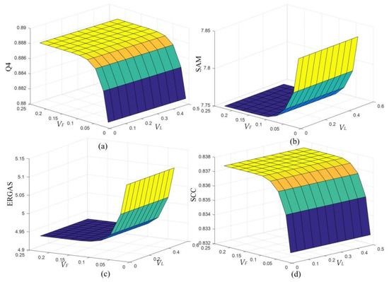 Analysis of the parameters VF and VL. (a) Q4. (b) SAM. (c) ERGAS. (d) SCC.