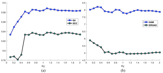 Analysis of the parameters αE.(a) Q4 and SCC. (b) SAM and ERGAS.