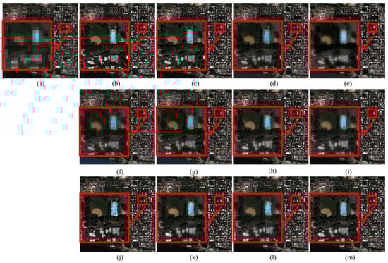 Pansharpening results of Washington dataset. (a) MS. (b) Ground-truth image. (c) PPCNN. (d) GS. (e) PCA. (f) BT. (g) IHS. (h) ATWT. (i) AWLP. (j) CBD. (k) MOF. (l) RAWLP. (m) FSR.