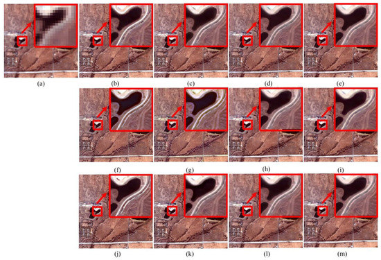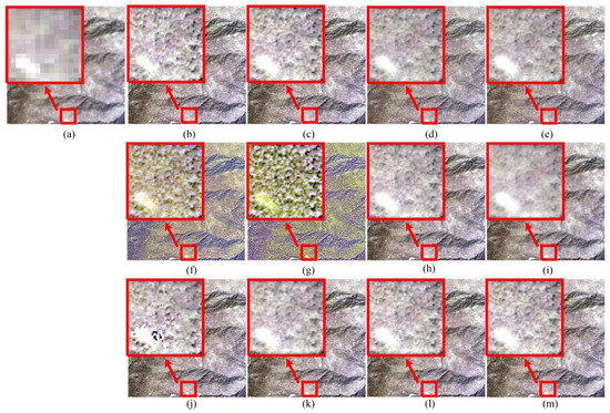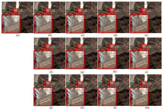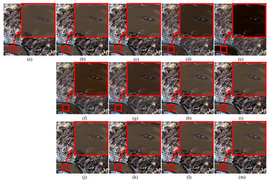 Pansharpening results of Xinjiang dataset. (a) MS. (b) Ground-truth image. (c) PPCNN. (d) GS. (e) PCA. (f) BT. (g) IHS. (h) ATWT. (i) AWLP. (j) CBD. (k) MOF. (l) RAWLP. (m) FSR.
