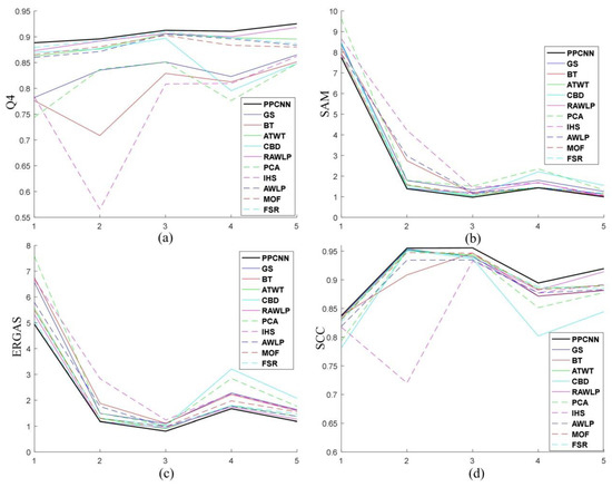 Comparison results of five datasets. (a) Q4. (b) SAM. (c) ERGAS. (d) SCC.