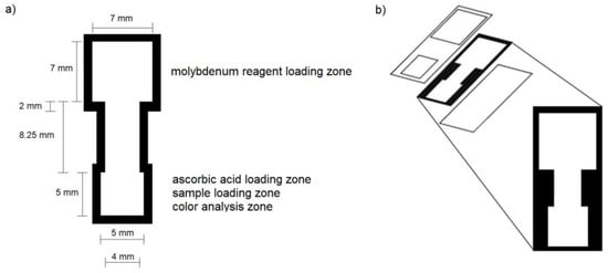 The final paper-based devices contained two zones: an ascorbic acid loading zone and molybdenum reagent loading zone (Figure 1). The device was designed in this way to ensure that the two reagents remained fully separated prior to device usage, as combining the two reagents led to undesired reactivity and degradation in less than 24 h [26]. Ascorbic acid was added to the devices in four separate 3 μL aliquots, with the stepwise addition used to ensure that the reagent remained in the loading zone. The devices were allowed to dry for at least 20 min between each ascorbic acid addition and prior to use of the device. No more than four aliquots could be used as excess reagent led to over-acidification of the reaction and a subsequent decrease in color readout.